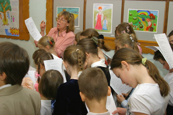 Сюда ребята приходят не только на уроки. Здесь педагог Александра Юрьевна проводит занятия хора и клиросного пения. Во время гимназических литургий дети поют на клиросе.